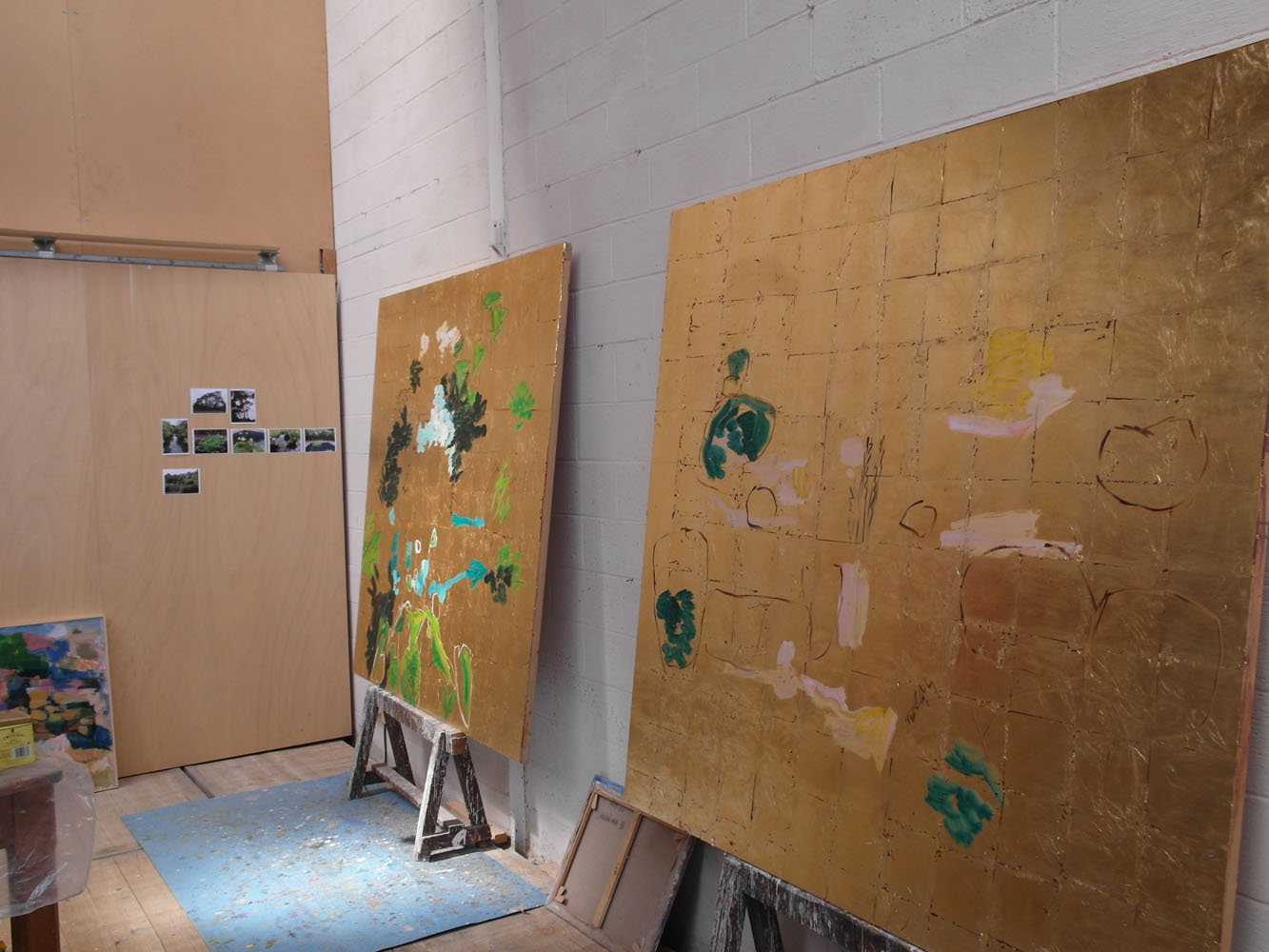 Posted on 28 avril 201828 avril 2018 by Vincent Vallois Printemps: commencement d’un grand triptyque paysager sur fond doré à la feuille trois peintures inspirées par des lieux différents: un jardin aquatique, un jardin de rocaille et plantes en méditerranée et une pinède